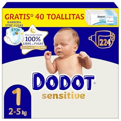 🇪🇸 Dodot Pañales Bebé Sensitive Talla 1 2-5 kg 224 Pañales + Regalo de 40 Toallitas Aqua Pure 99% Agua Hasta 12 h De Protección Antifugas y Cuidado de la Piel Pack Mensual