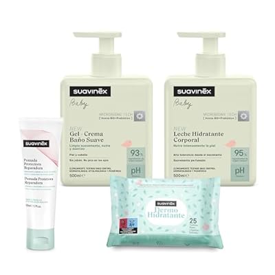 Suavinex Pack Cosmética Bebé con Gel Champú Suave 500 ml + Crema Hidratante 500 ml + Pomada Pañal 50 ml + Toallitas 25 uds. Apto Pieles Sensibles Recién Nacidos 93-95% Ingredientes Origen Natural